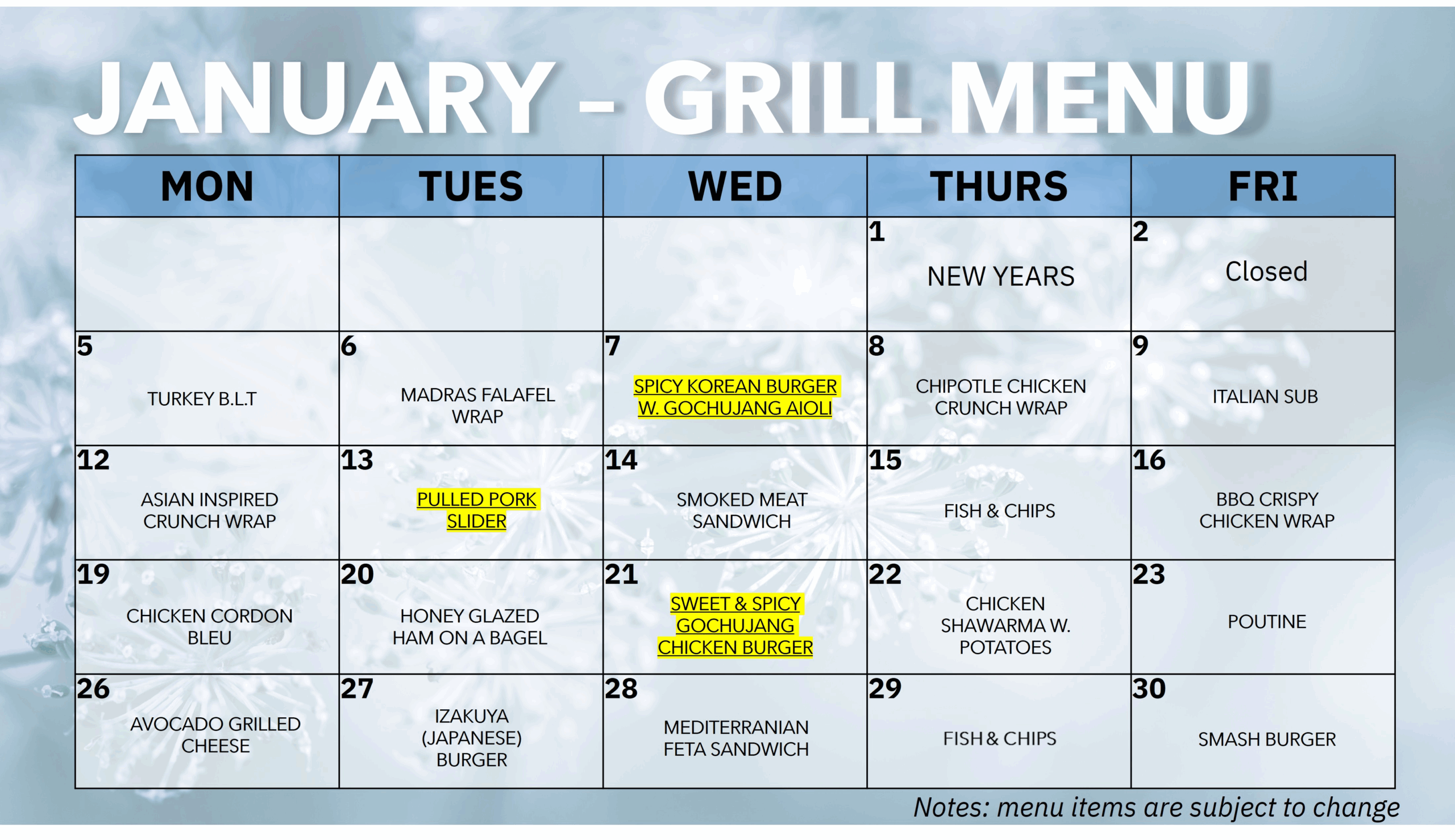 This menu changes weekly. Please check back each week to see our current menu.