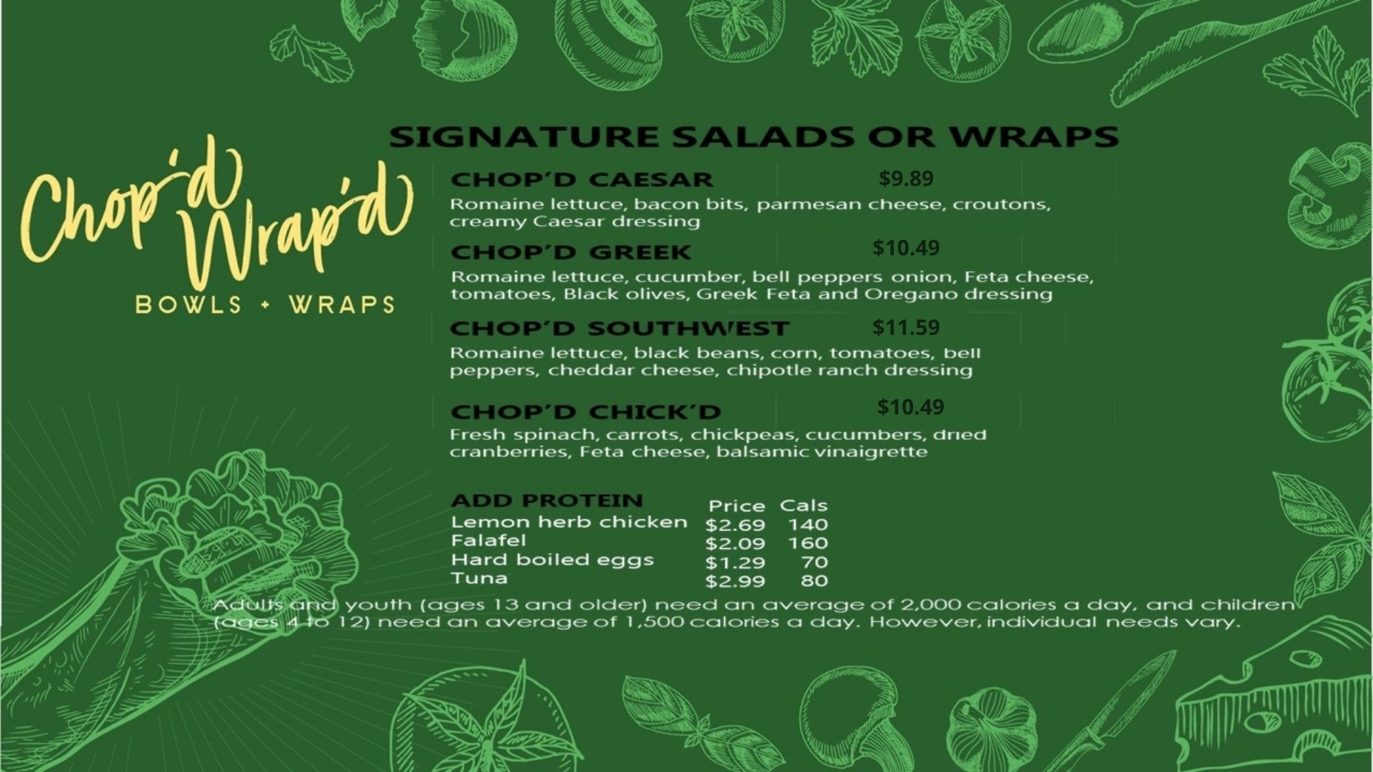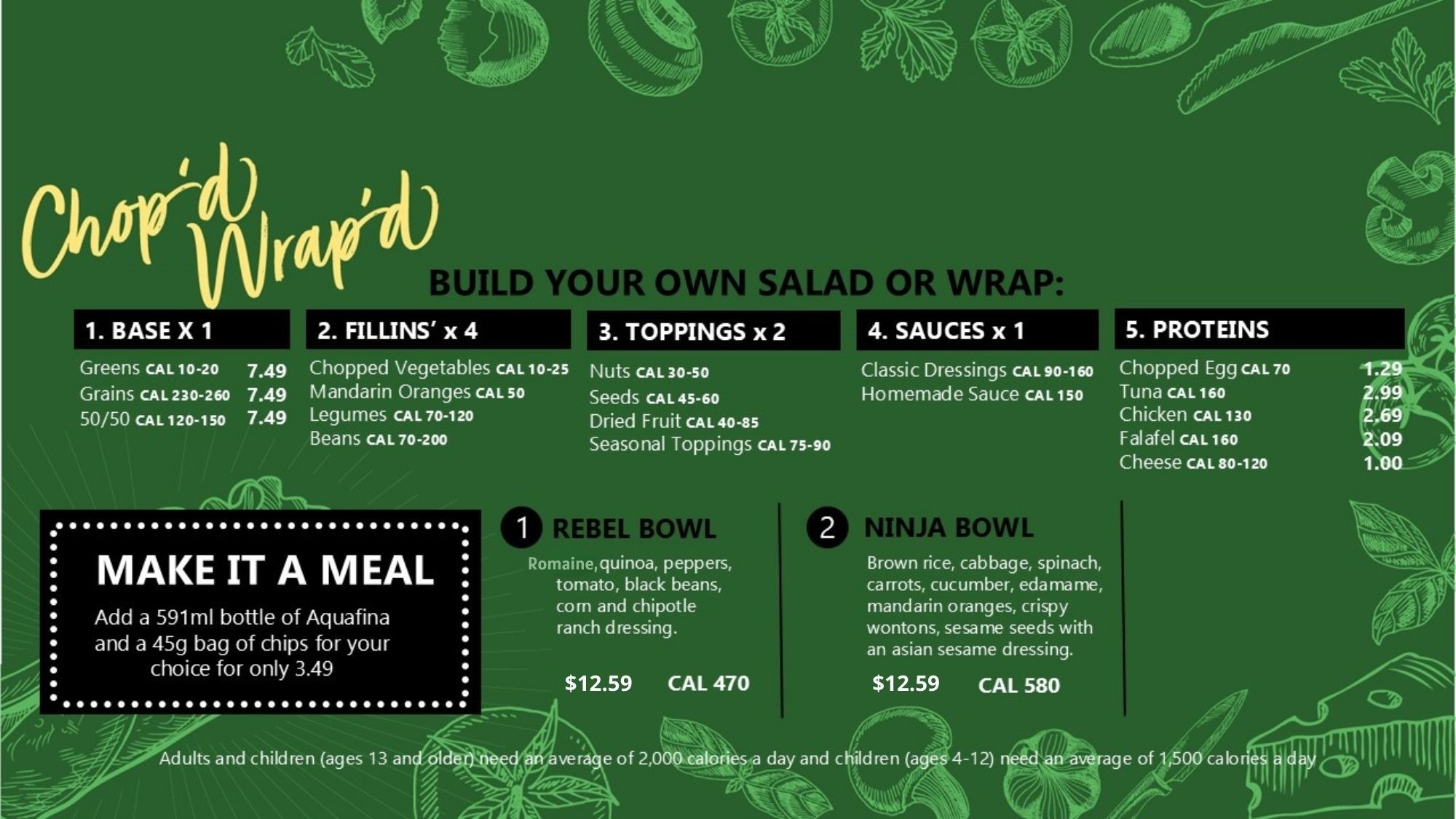 At Chop’d & Wrap’d, you are free to create your own culinary masterpiece! The option to ‘Build-Your-Own’ allows you to design the perfect salad or wrap tailored to your exact preferences. Packed with vitamins, minerals, fibres and protein.. Our ingredients will leave you feeling energized and satisfied!!